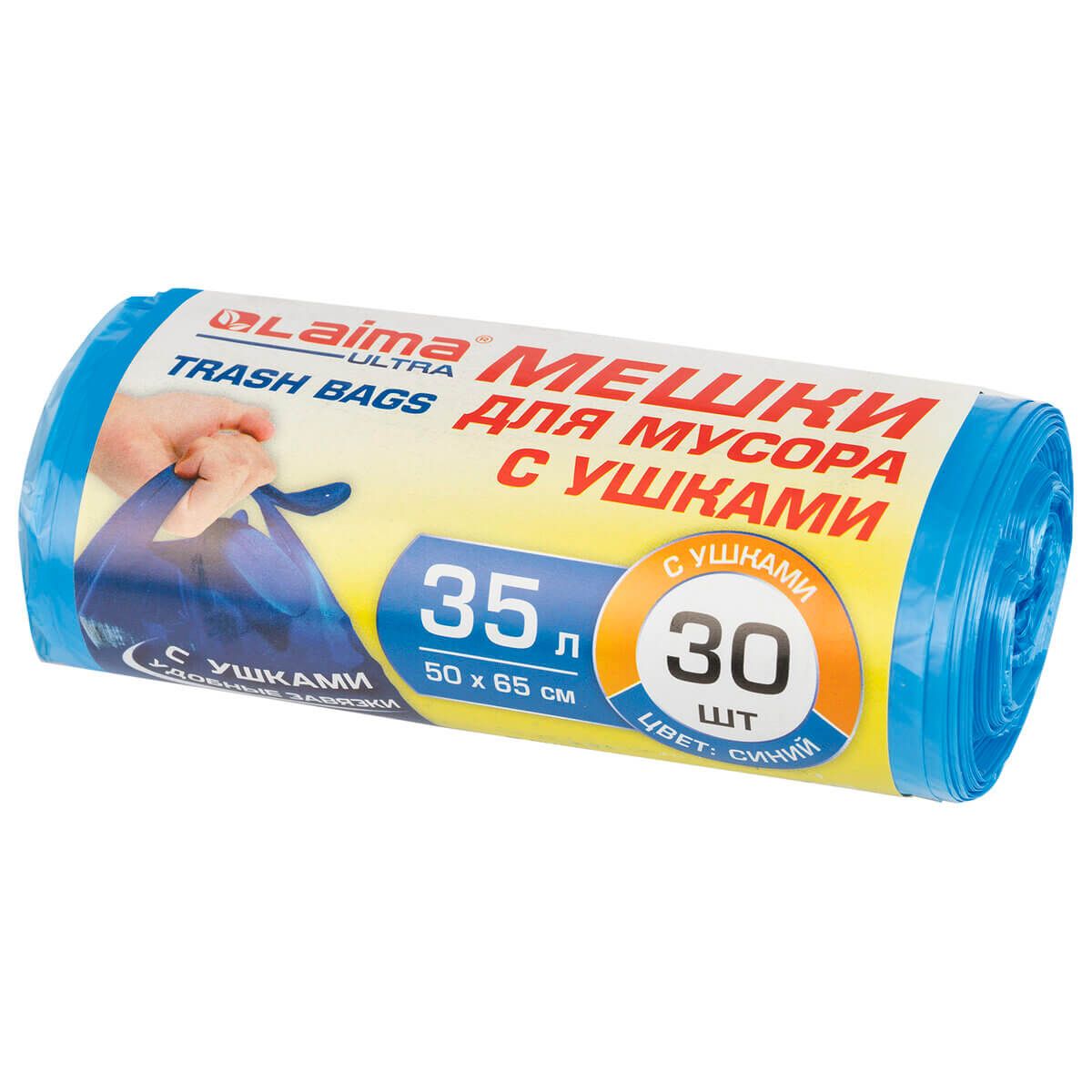 Мешки для мусора 35 л, с ушками, синие, в рулоне 30 шт., ПНД, 11 мкм, 650х500 мм, LAIMA ULTRA, 607684 в Оренбурге